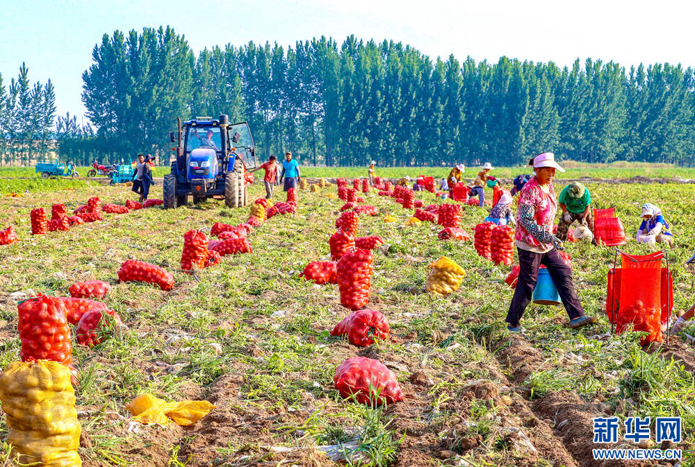 6月25日,在青岛西海岸新区六汪镇,种植户在田间收获马铃薯。新华网发(张进刚 摄)