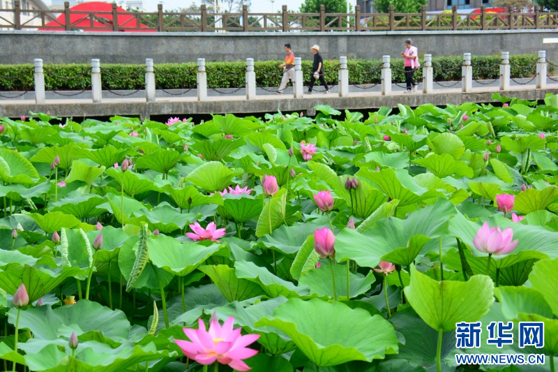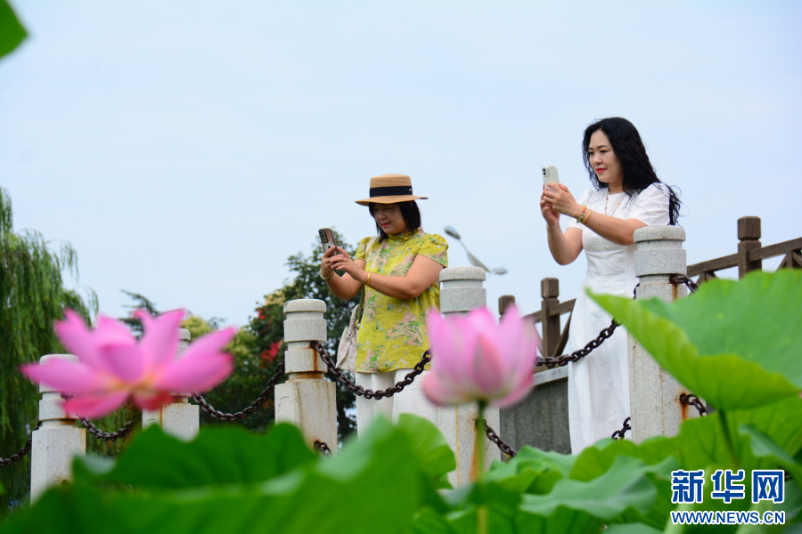 荷花次第绽放,市民拍照留念。新华网发(张乐民 摄)