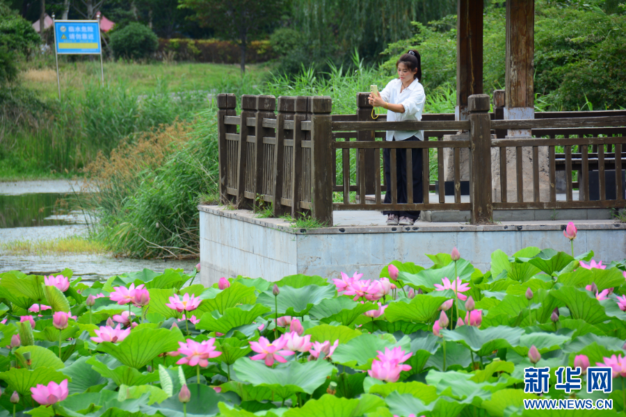 市民在墨泉“口袋公园”欣赏荷花美景并拍照。新华网发(李学飞 摄)