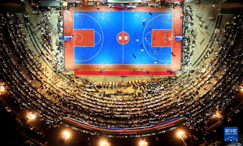 这是8月8日在莱西市人民广场拍摄的莱西市篮球联赛现场。