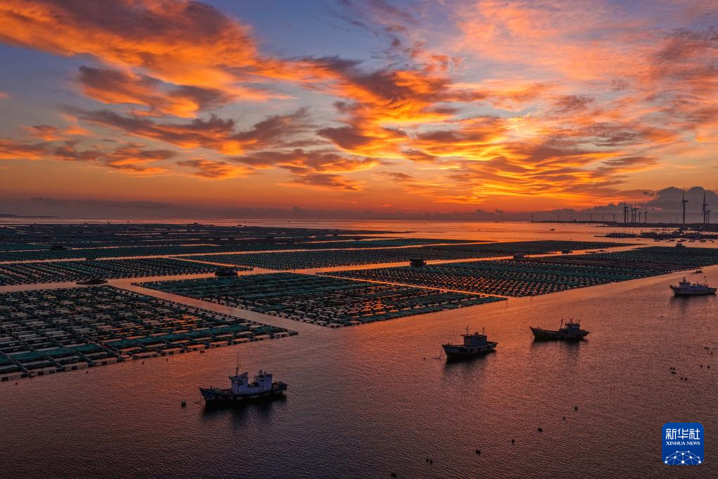 当日,山东省荣成市石岛管理区桑沟湾海域朝霞绚丽,渔民驾驶渔船前往生态网箱养殖区进行秋管作业,海上生产一派繁忙景象。新华社发(李信君 摄)