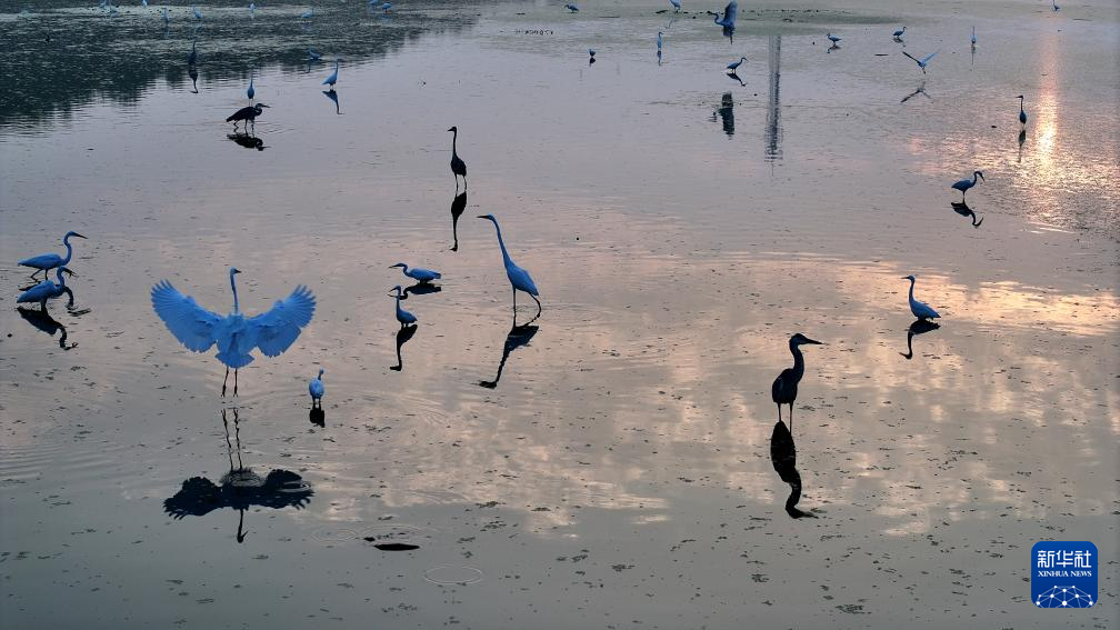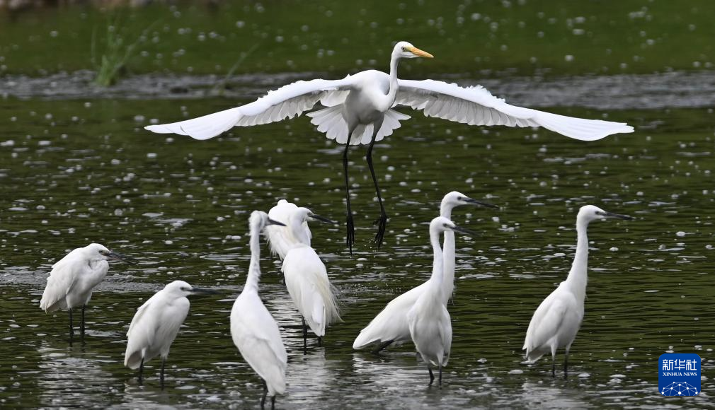 8月11日,在山东省荣成市桑沟湾湿地公园一处水域,成群的黄嘴白鹭、苍鹭等在休憩觅食。