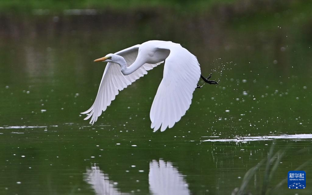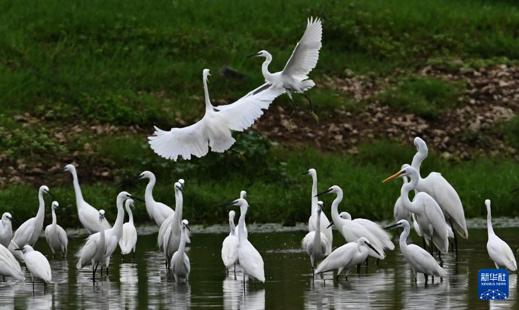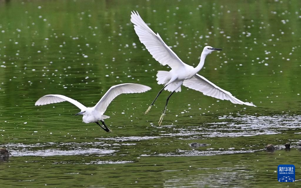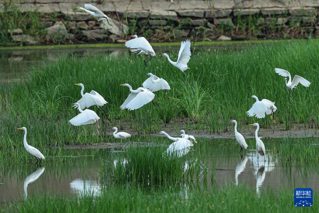 8月7日,白鹭在山东省高密市境内的胶河湿地觅食(无人机照片)。